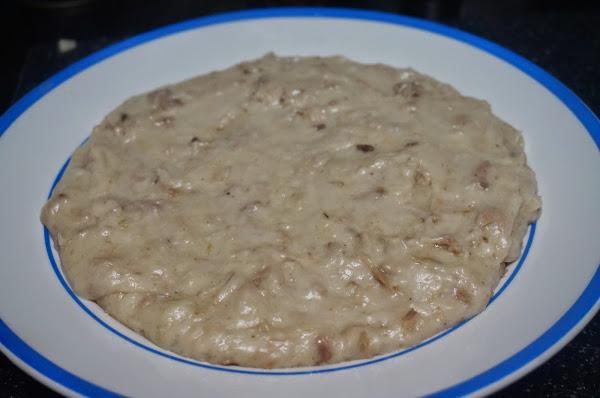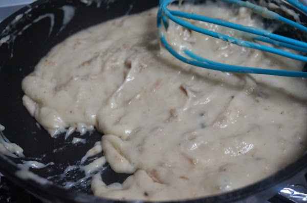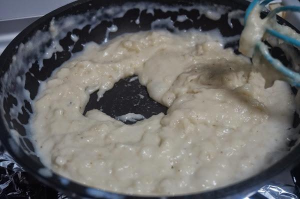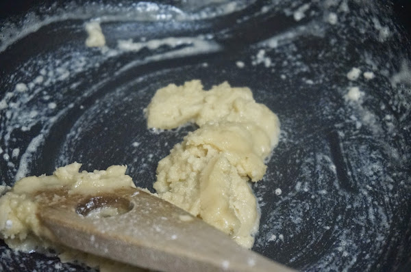 Seguiremos echando leche hasta que se vaya formando una masa que se despegue de la sartén, echaremos una puntita de nuez moscada.