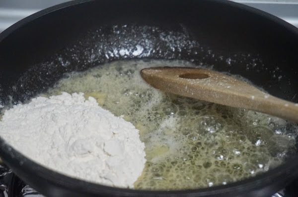 Añadimos la harina y la tostamos un poco hasta que se mezcle bien con la mantequilla.