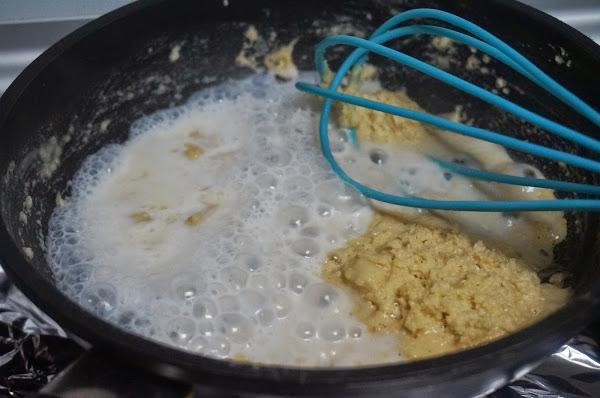 Cuando esté, iremos echando la leche poco a poco y removiendo sin parar, yo calenté la leche en el micro.