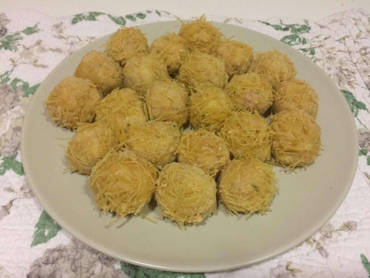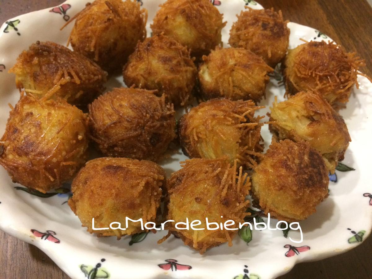 Estas croquetas las he hecho redondas y pequeñas a petición de mi hija., lo de crujientes (fideos finos) lo aprendí en casa de una amiga , me gustó bastante y además de no quitarles sabor las hace diferentes…