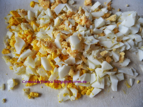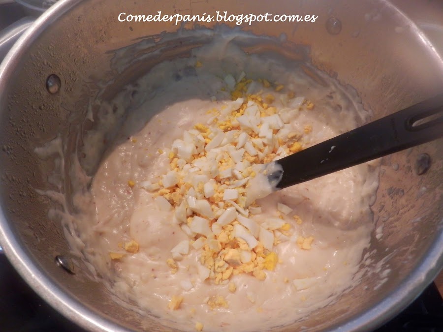 Ahora llega el momento de trabajar la bechamel, cocinar la masa durante 10 minutos removiendo para que no se pegue. Transcurrido el tiempo, añadir los huevos troceados, el atún y mezclamos.