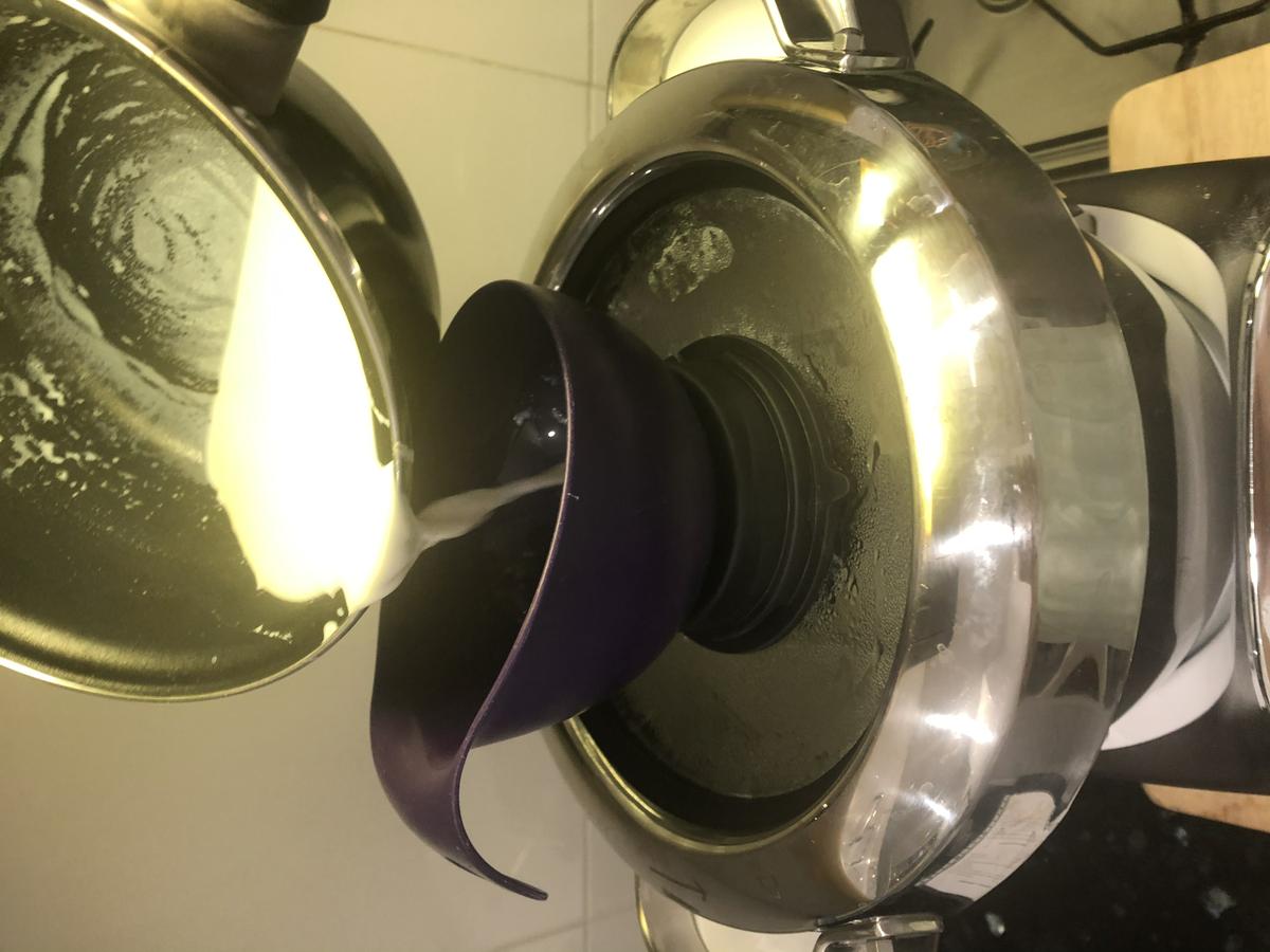 4. Escurrimos el atún y lo desmigamos. A continuación, programamos velocidad 4, 110º, 15 minutos y damos a START. Mientras avanza el programa, agregamos la leche por el bocal. A la mitad del tiempo o así, aumentamos a velocidad 6 y añadimos el atún. Podemos ayudarnos de un embuda para añadir la leche al bol.