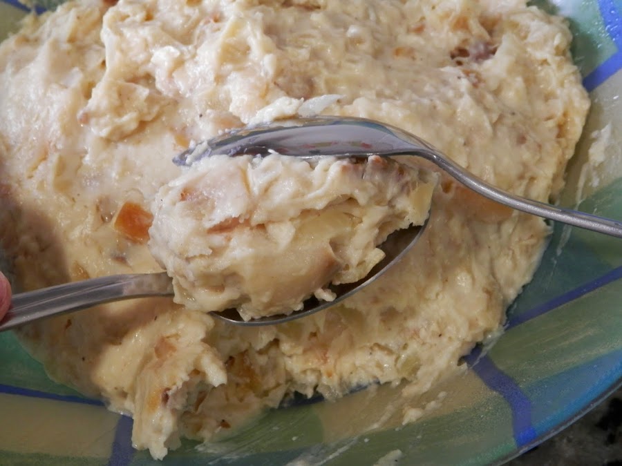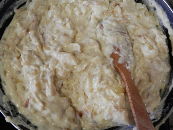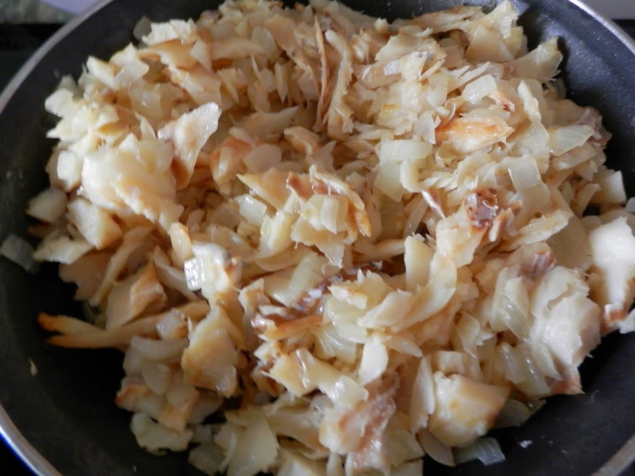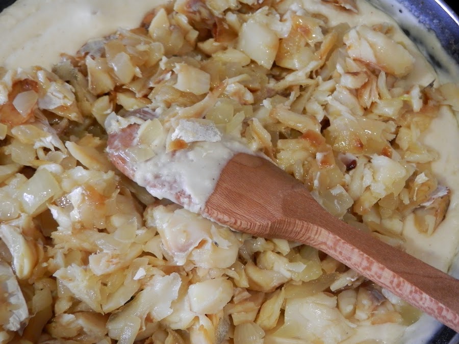 Una vez hecha la bechamel, añadimos a ésta la cebolla y el bacalao y removemos hasta que todo está bien mezclado.