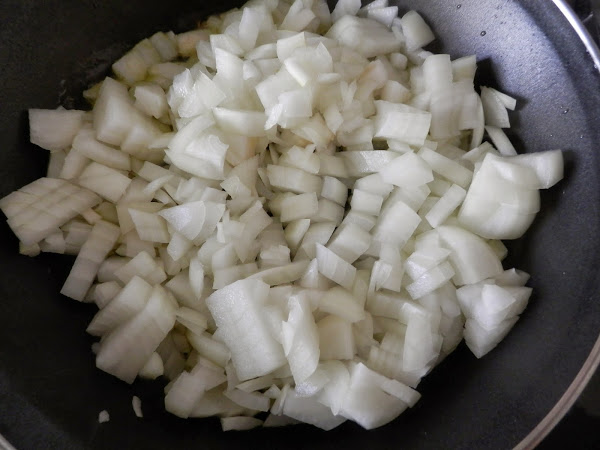 Ponemos una sartén con aceite y cuando esté caliente añadimos la cebolla, rehogamos sin que la cebolla llegue a dorar.