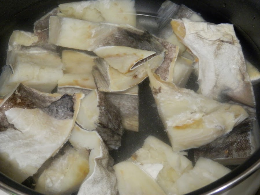 Ponemos a desalar el bacalao el día de antes, cambiando el agua cada tres horas.