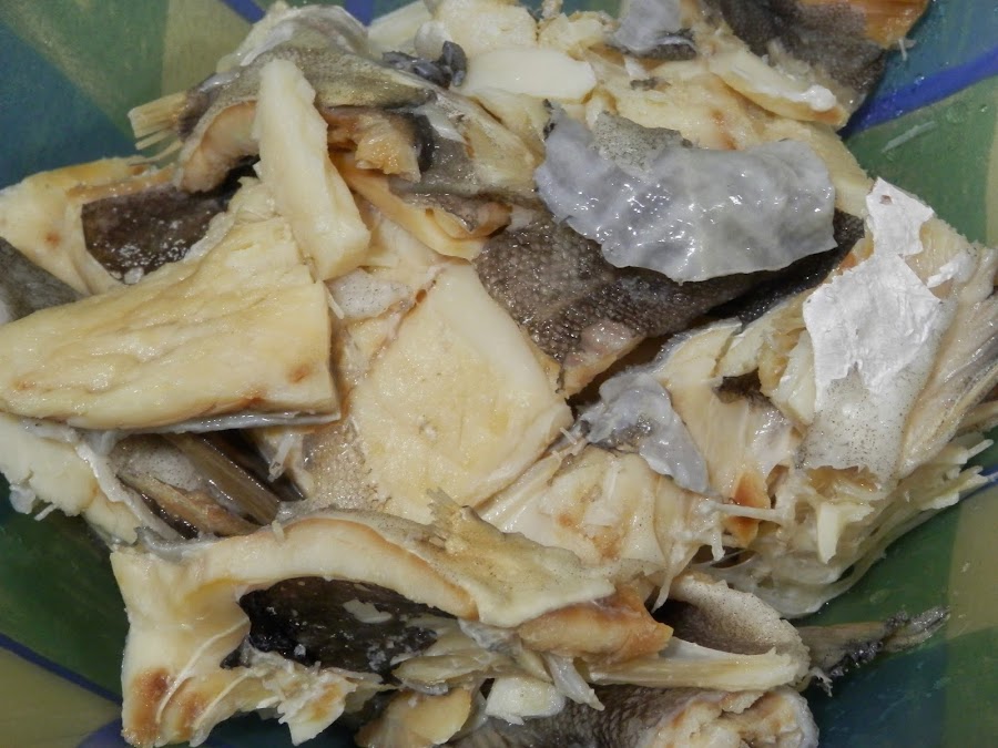 Cocemos el bacalao un poquito y quitamos espinas y piel.