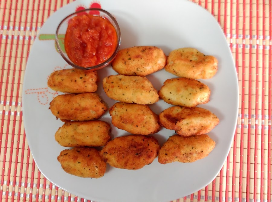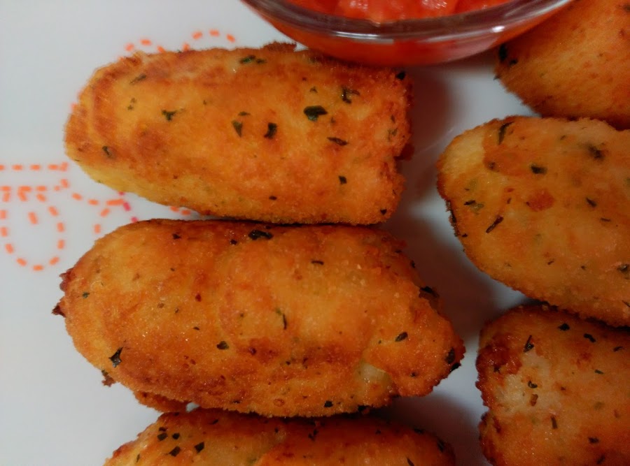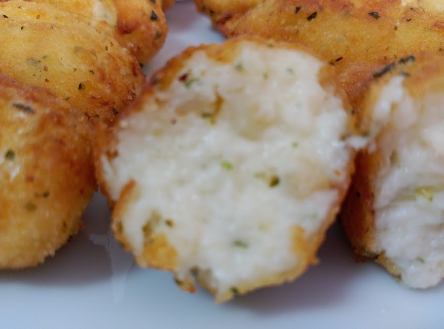 Cuanto esté fría, ve cogiendo poco a poco trocitos y dale forma de croqueta. Pasa por el huevo batido y después por pan rallado.