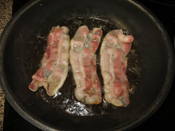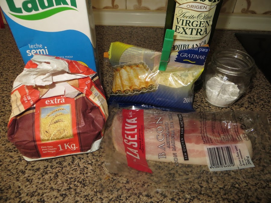 Echamos en la sartén una cucharada de harina cuando la tenemos cocinada añadimos la otra cucharada de harina y la dejamos hasta que se cocine. Ahora vamos añadiendo la leche poco a poco mientras le vamos dando vueltas para que no salgan grumos. Añadimos un poco sal. Cuando tenemos la bechamel casi lista añadimos el queso rallado y seguimos dándole vueltas para que se deshaga y justo antes de sacar la bechamel del fuego añadimos el bacon y lo removemos para que los trozos se esparzan por toda la bechamel.