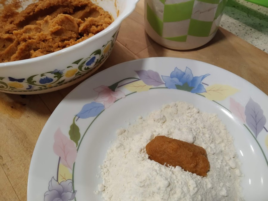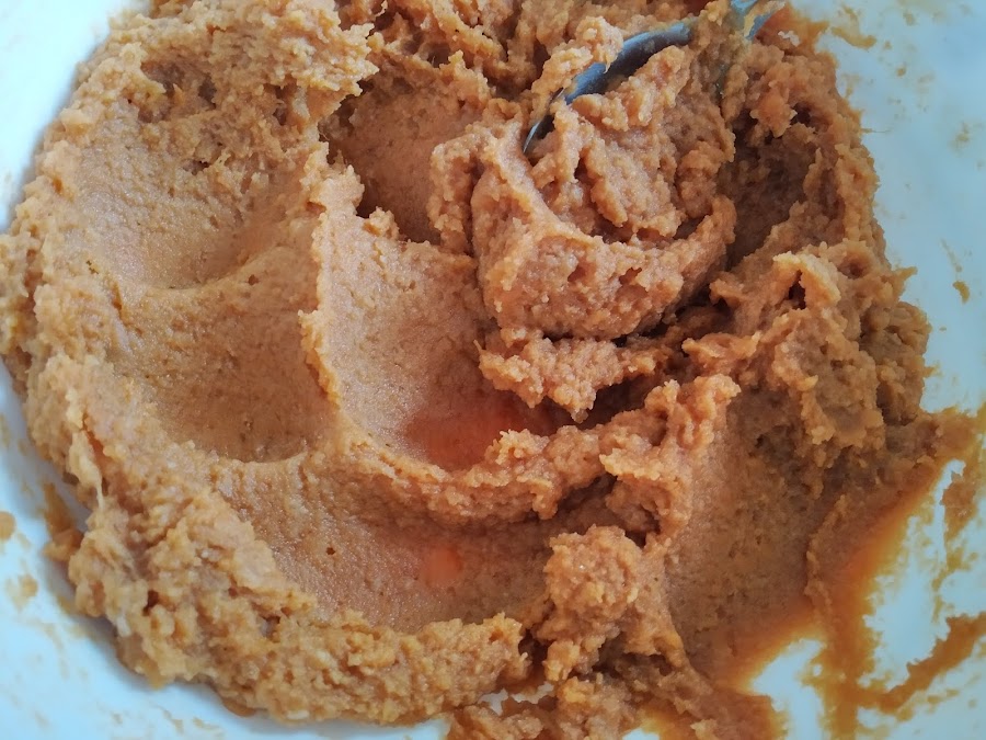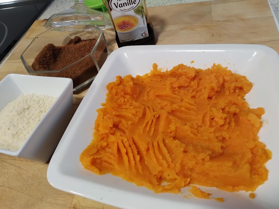 En un cuenco echar el puré de calabaza, el azúcar moreno, la almendra molida y la vainilla,