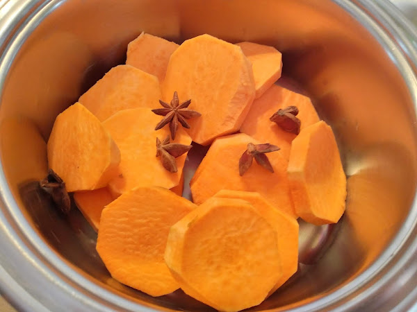 Cuando esté tierna los trozos de batatas, escurrir bien de agua (desechar los anises) y triturarla de forma que quede lo más fina posible.