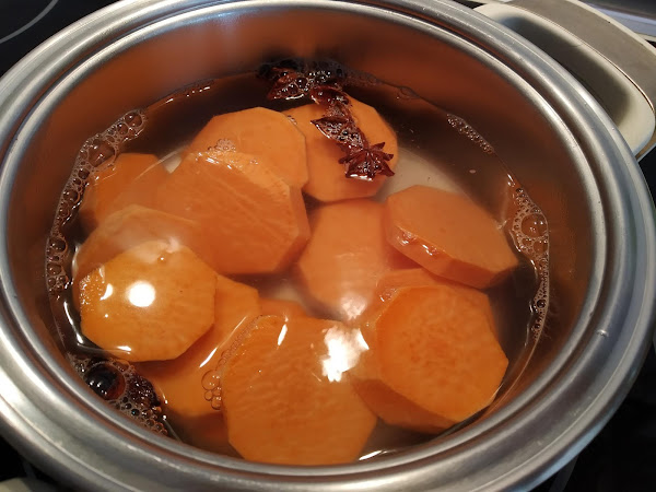 Pelar la calabaza y trocear. En una cacerolita echar el agua, incorporar los trozos de batata y el anís, ponerla al fuego y llevar a ebullición, dejándola cocer hasta que pinchando algún trozo de calabaza se compruebe que esté tierna.