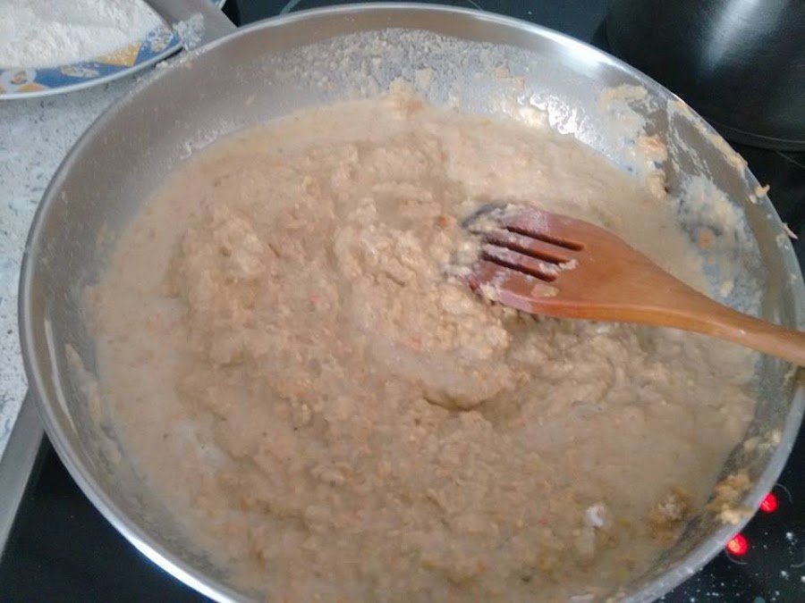 en una sarten grande ponemos una cucharada de mantequilla,añadimos nuestro puré, rehogamos sin parar añadimos la harina agregamos leche poco a poco, después a fuego medio dejamos reducir siempre sin dejar de mover para que no se pegue, hasta que veamos que se despega bien en la sarten la masa, ese será el momento de apartarla.