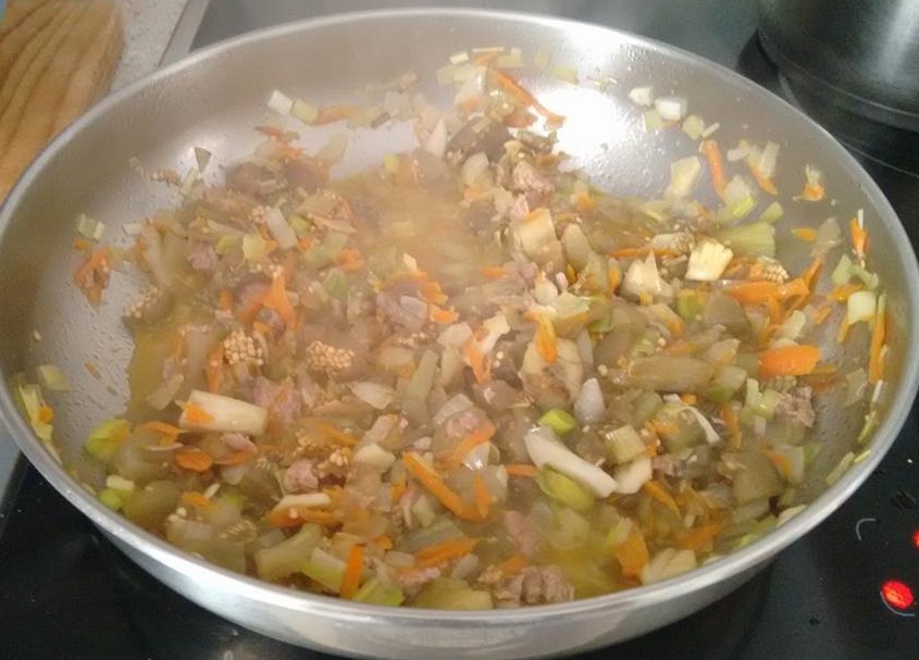 Ponemos una sarten con un poco de aceite y echamos la zanahoria, cebolla, ajos y puerro, salpimentamos, rehogamos uno 4 o 5 minutos, añadimos las berenjenas cocidas, el atún, rehogamos un par de minutos añadimos en tomate rallado dejamos otro minuto y apartamos del fuego.