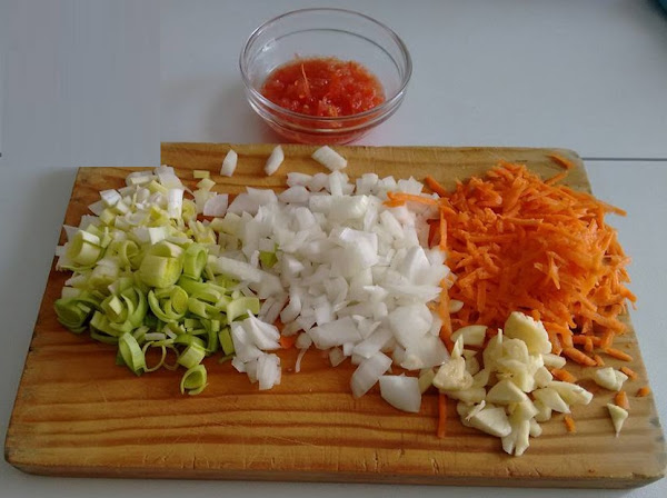 Pelamos la zanahoria y la rallamos, pelamos la cebolla y la cortamos en trozos pequeños, lo mismo con el puerro y los ajos.