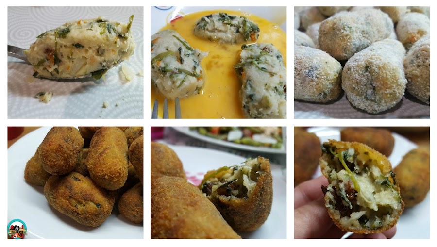 4.- Preparamos las croquetas: Con la ayuda de dos cucharas formamos las croquetas, tomando pequeñas porciones de masa. Pasamos cada croqueta con los huevos batidos y el pan rallado mezclado con una cucharada de harina. Cuando todas las croquetas estén formadas las freímos en abundante aceite caliente y las escurrimos bien sobre papel de cocina.