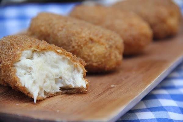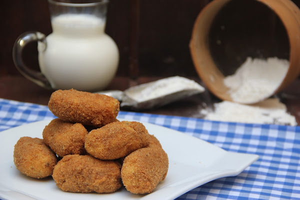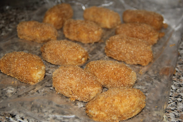 Una vez fría tomamos porciones para formar las croquetas, rebozándolas en huevo batido y pan rallado. yo las rebozo dos veces, es decir primero las paso por huevo y luego por pan rallado para pasarlas de nuevo por huevo y otra vez por pan rallado.