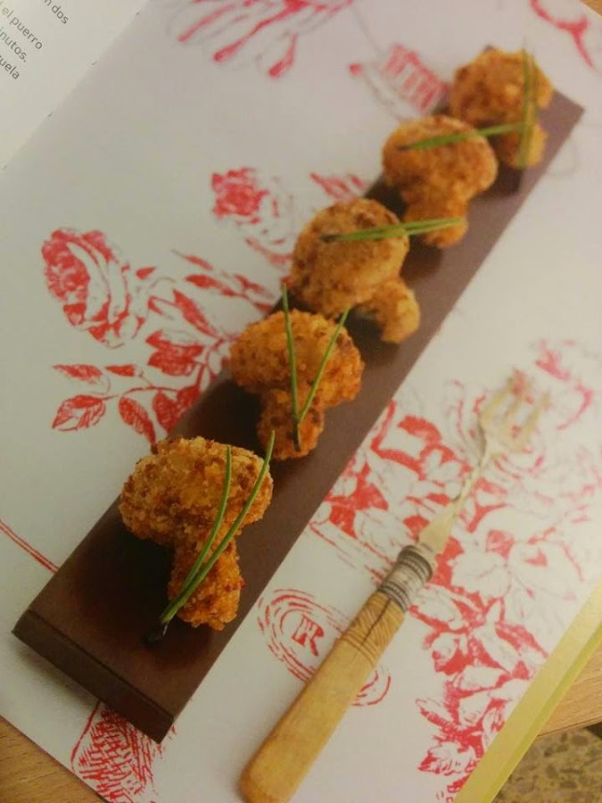 Hace ya unos cuantos meses me compré un libro de Carme Ruscalleda y la verdad que como de normal me invento yo las recetas, pues mucho caso no le había hecho. Había ojeado por encima y ya está. Pero un día dije... voy a ver qué encuentro y a ver si hago algo de lo que tiene ella por ahí, o al menos parecido... Y ale, encontré estas riquísimas croquetas!!! Super jugosas por dentro... se deshacen en la boca... :-P