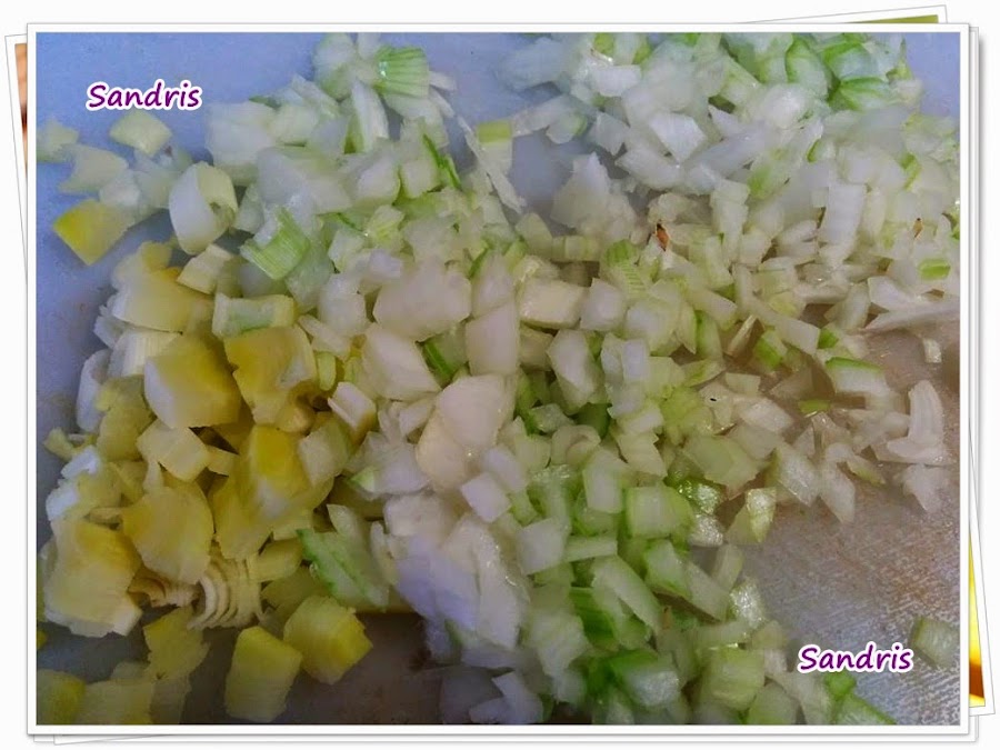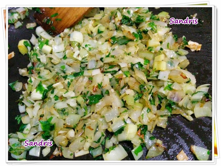 En la misma sarten, podemos sofreír el puerro y la cebolla, luego agregamos los ajos y el perejil. Y reservamos.