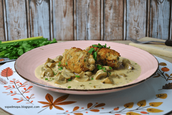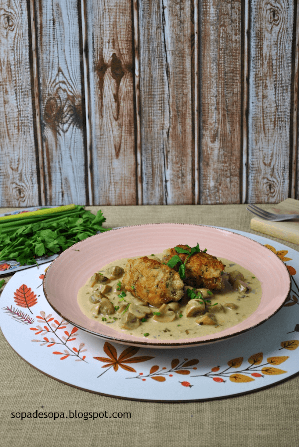 Para servir; poner en los platos una cama de champiñones en salsa y encima un par de croquetas por comensal.