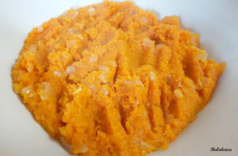 4. Incorporamos los trozos de calabaza y mareamos mientras la vamos aplastando poco a poco con la ayuda de una cuchara de madera.