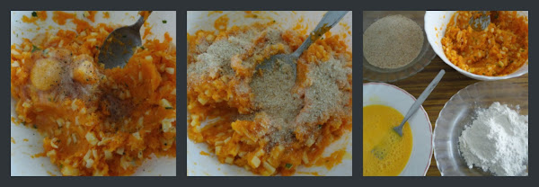 Formamos pequeñas pelotitas con la masa que pasamos por harina, huevo batido y pan rallado y freímos en abundante aceite caliente.