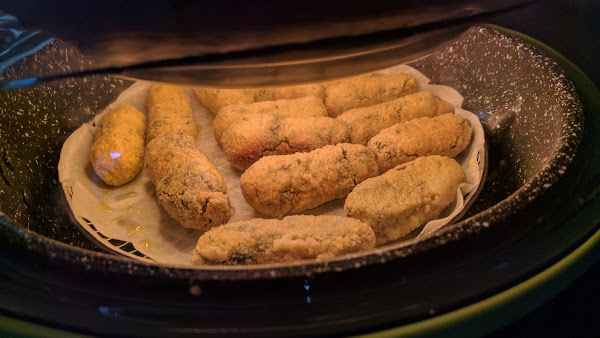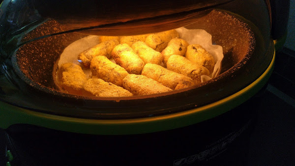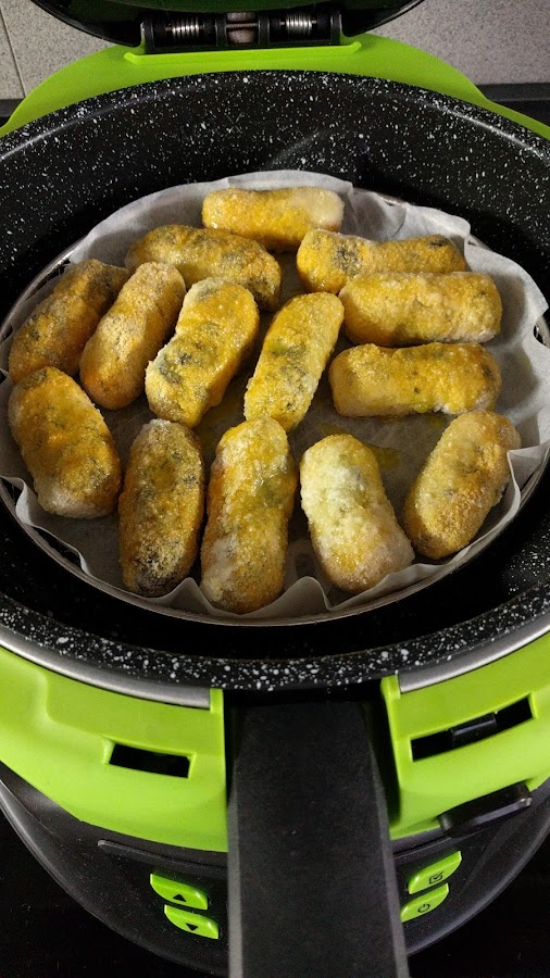 en Cecofry programar 20 minutos y poner a calentar la cubeta 4 minutos. Colocar papel de hornear sobre el cestillo para freír y organizar las croquetas. Poner en la Cecofry y rociar con un flus de aove. Pasados 6 minutos volver a rociar con flus de aceite. A los 2 minutos dar la vuelta y rociar con flus y dejar hasta acabar o hasta ver doradas.