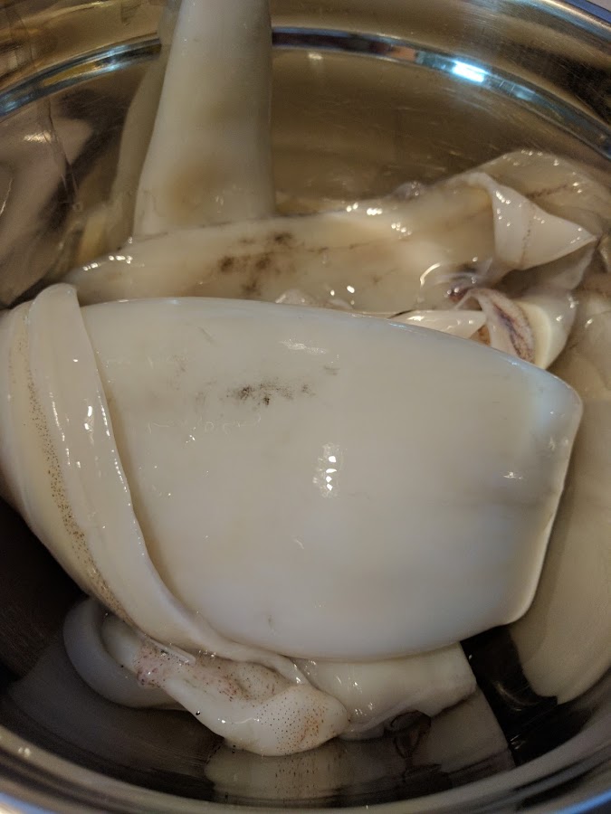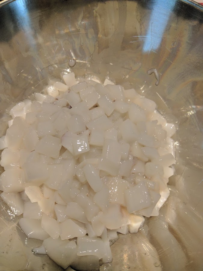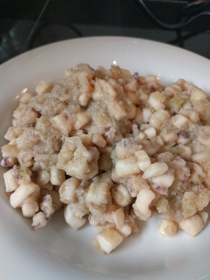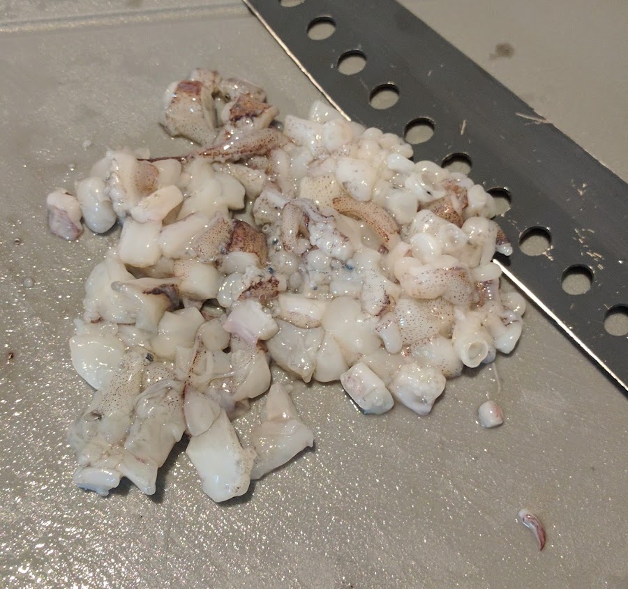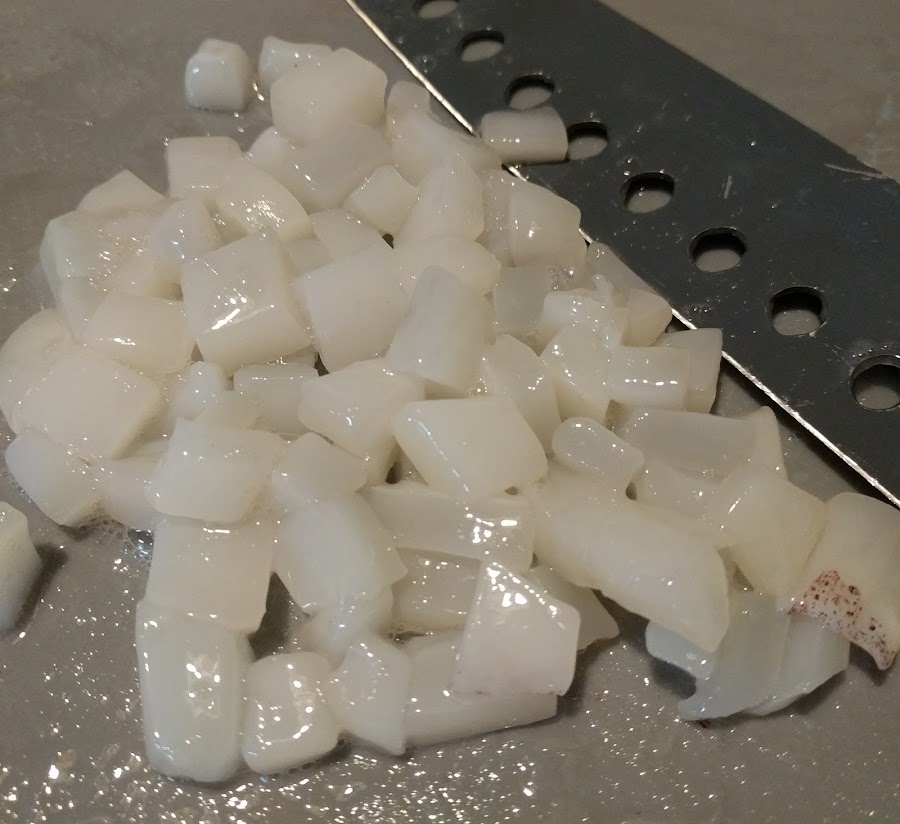 Necesitamos calamar bueno, si es de potera genial. Yo compré unos 800 g, eran tres calamares, y me los limpiaron. No los compres demasiado grandes. Con ayuda de un buen cuchillo, o tijeras como mejor te apañes, haz pedacitos de un cm más o menos. Es lo más tedioso y no lo tritures con la MC porque no queda igual. Trocea también los tentáculos. Tienes que utilizar 400 g. El resto congélalo para otra receta.