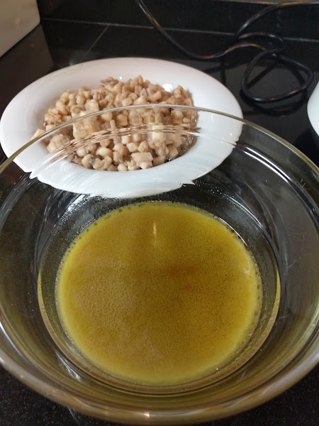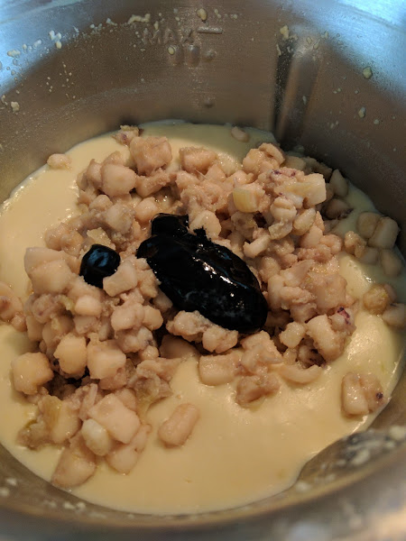 Sin lavar el vaso ponemos una cebolla dulce pequeña en trozos, 6 minutos y temperatura 110, vel 1. Añadimos 180 g de harina y programamos 5 minutos a 100 grados y velocidad 3.