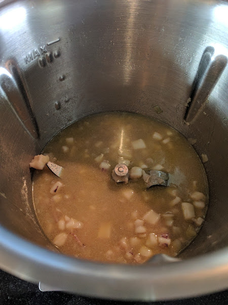 Añadimos los trocitos de calamar y programamos 15 minutos, 110 grados, marcha atrás y velocidad 1 (los primeros 7 minutos sin cubilete y el resto con el)