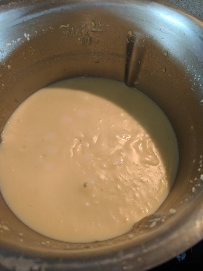 Pesamos el caldo reservado y completamos con leche hasta obtener 800 g. Añadimos al vaso y trituramos en velocidad 8, 20 segundos. Salamos muy ligeramente y programamos 9 minutos, 120 grados y velocidad 3, sin cubilete.