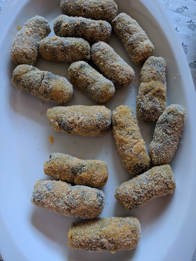 Deja la masa en la nevera, para que se enfríe bien, de un día para otro. Así estará lista para envolver las croquetas. Con las imágenes te harás una idea de como envolverlas (pasa por pan rallado, huevo y de nuevo por pan rallado) Disponlas en bandejas planas para congelar
