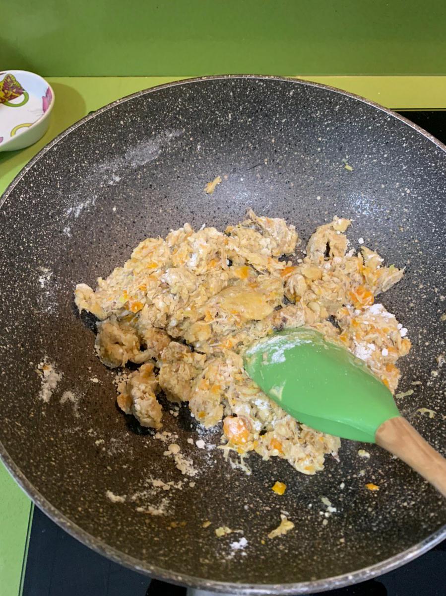 Seguidamente troceamos el pollo y la zanahoria en trozos pequeñitos. Yo los desmigue con los dedos pero podéis cortarlo a cuchillo o tijeras.