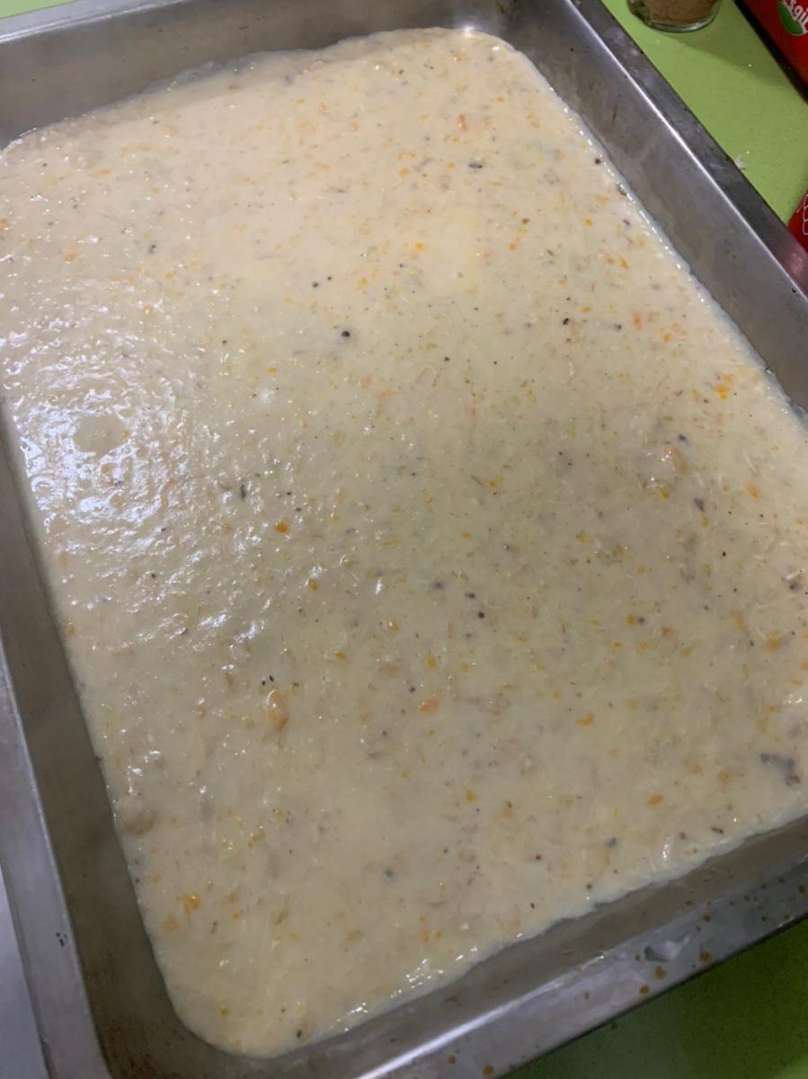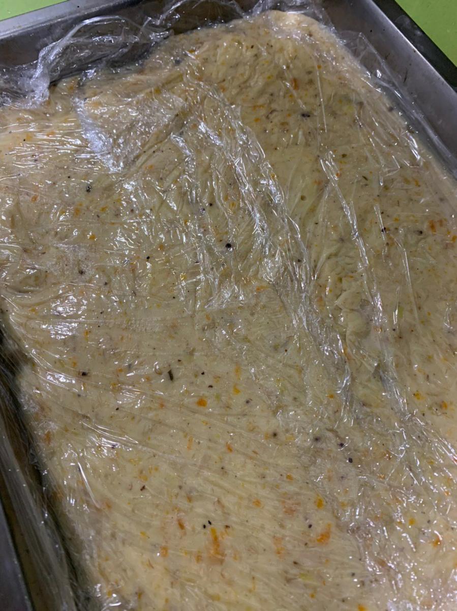 Preparamos una bandeja de horno o un recipiente para poder volcar la masa y dejarla estirada y tapada con papel film a piel( pegada a la masa) y reservamos en la nevera de un día para otro.