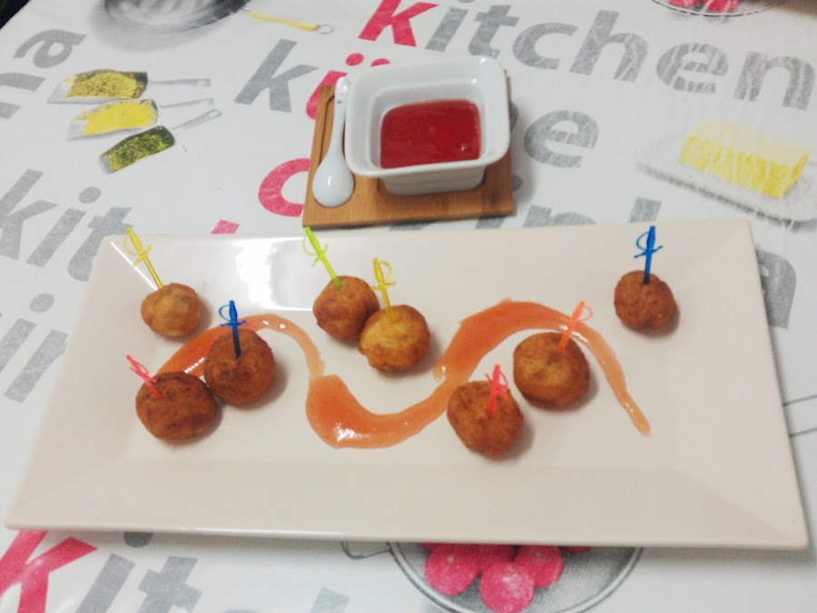 7- Formar las croquetas , pasarlas por huevo y pan rallado y freír en abuendante aceite caliente.Podéis acompañarlas con mermelada de tomate o pimientos.