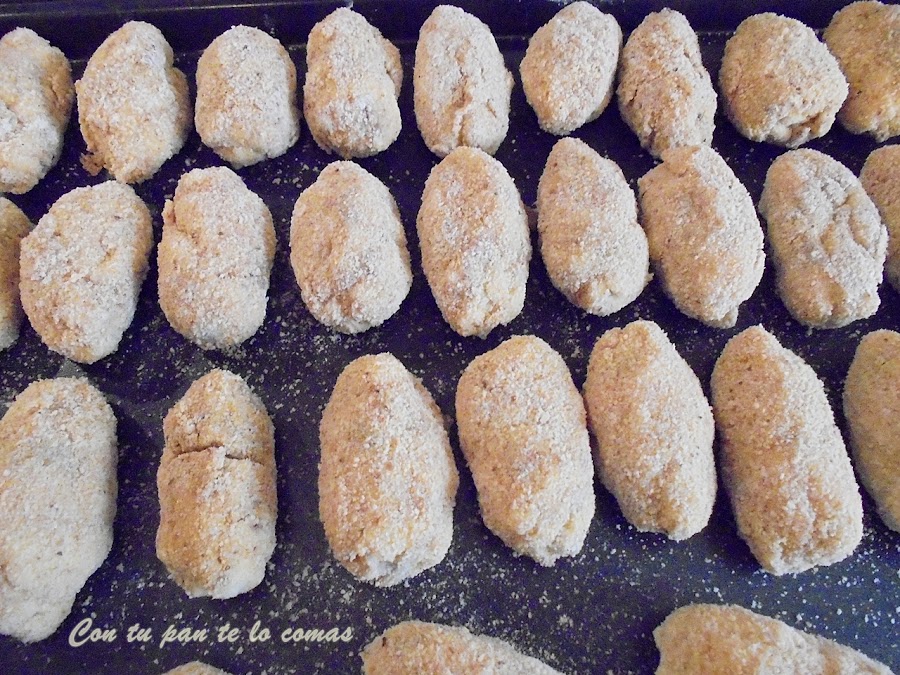 4. Una vez fría (yo la dejé hasta el día siguiente), haces las croquetas como tengas por costumbre y las rebozas en harina, huevo y pan rallado. Si las vas a congelar, éste es el momento.
