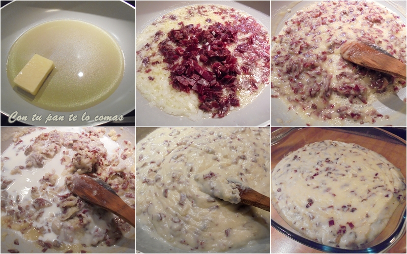 1. Con el aceite y la mantequilla empezamos a pochar la cebolla picada muy chiquitita. Cuando empiece a ablandarse añades la cecina también muy troceada.