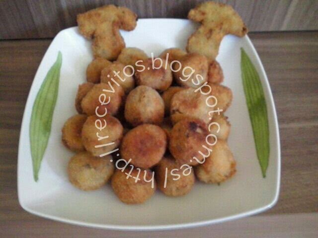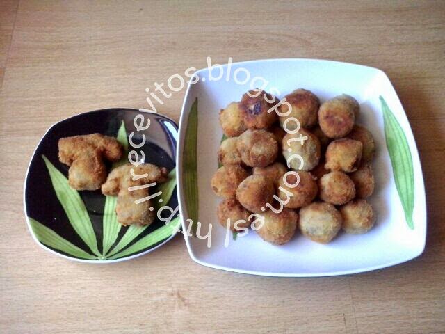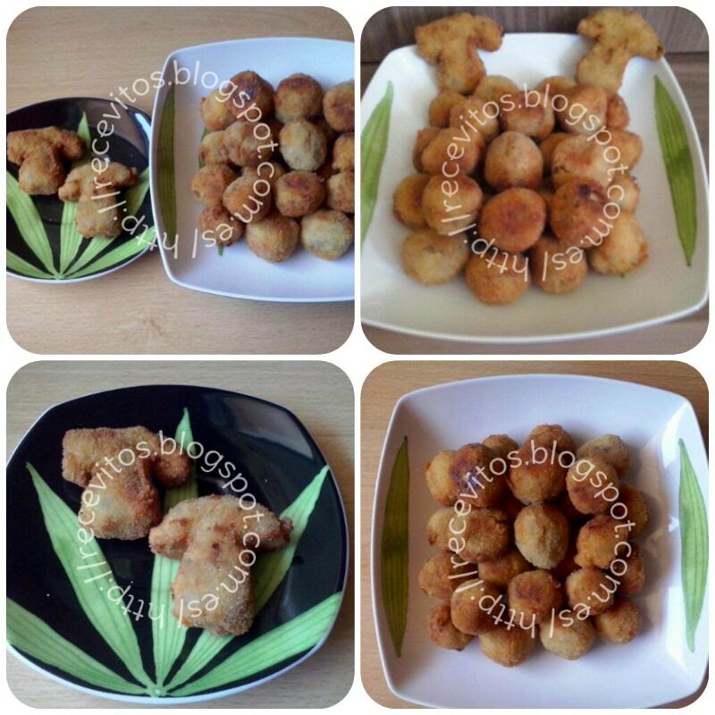 Cortamos la masa en tiras de dos dedos de grosor pasamos por la harina como si fuera un rodillo, cortamos con las tijeras porciones y le damos la forma deseada (alargada, redonda o con in cotspastas en gotma de champiñón) pasamos por huevo y después por pan rallado, repetimos la operación hasta acabar con la masa.