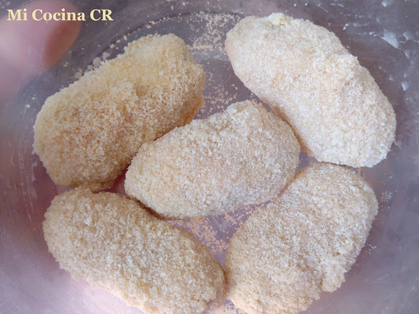 100 grms. de almendra cruda en polvo, 50 grms. de coco en polvo (en receta original harina de frutas), 5 grms. de azúcar avainillado, un vaso de maicena, dos huevos y pan rallado (éste último ingrediente es de "mi cosecha" personal, debido al miedo de que se deshicieran al freirlas)