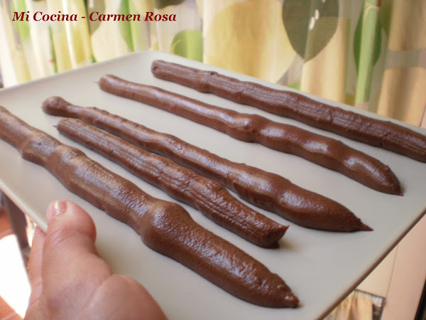 Cuando haya atemperado el chocolate, verterlo en el interior de la manga, ayudándose de una lengua de pastelero, procurar rebañar la cacerola donde se hizo el ganaché (así se aprovechará al máximo tan deliciosa crema de chocolate).