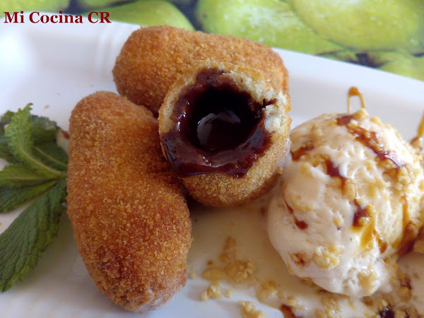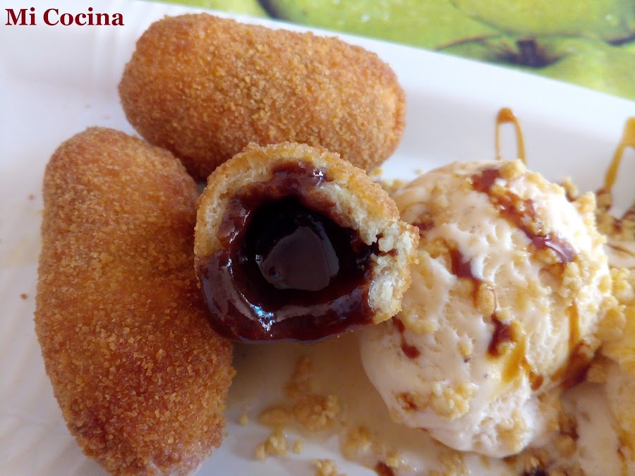 Para freírlas aconsejo freidora y aceite de girasol o un aceite de oliva muy suave que deberá estar muy caliente (suelo usar freidora) a fin de que se doren por fuera, que queden crujientes y el chocolate quede semi-derretido por dentro.