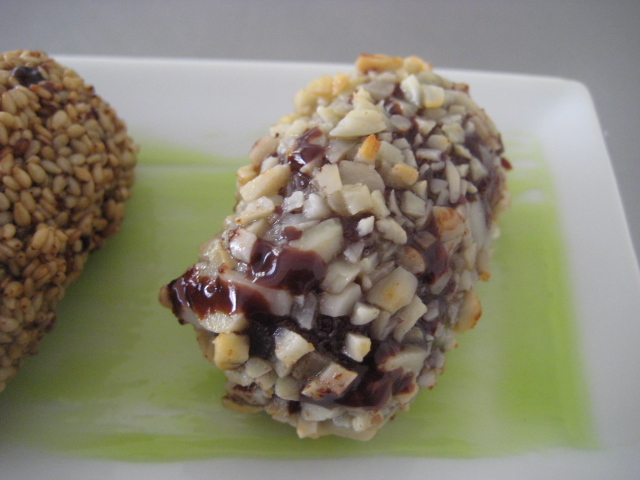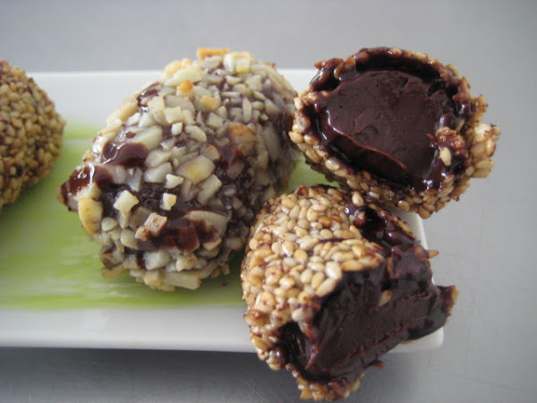 Preparación: Hidratar las hojas de gelatina en agua. Mientras tanto calentar en un cazo la nata (crema de leche) y cuando esté bien caliente diluir en ella la gelatina y verter en el bol donde tendremos el chocolate. Remover bien hasta que éste se haya fundido totalmente. Enfriar bien. Lo mejor es dejarlo en frío hasta el día siguiente. Formar las croquetas y pasar primero por harina, luego huevo batido y finalmente por granillo de almendra o sésamo sin tostar. Podemos hacer la mitad de cada cosa. Luego pasar al congelador y dejar hasta que se deseen freír porque es mejor freírlas congeladas. Freír en abundante aceite de girasol bien caliente y con cuidado para que no se abran. Emplatar con alguna fruta, salsa o coulis, helado, sorbete, cremoso..etc.