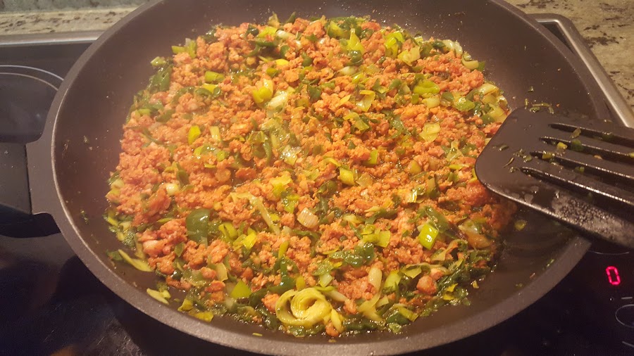 Ponemos en una sartén un chorro de aceite,picaremos los puerros y los pimientos,cuando el aceite coja temperatura agregaremos y saltearemos,a continuación añadiremos el chorizo desmenusado rehogaremos bien y sazonamos.
