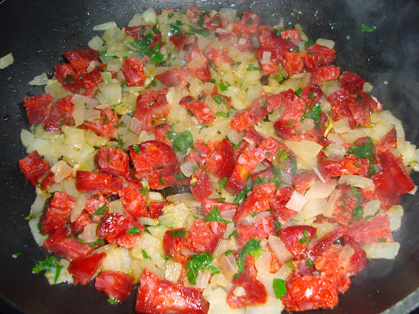 En una sarten poner a sofreir la cebolla y los ajos picados, cuando esté pochado agregar el chorizo cortado en daditos pequeños y sofreir un poco.