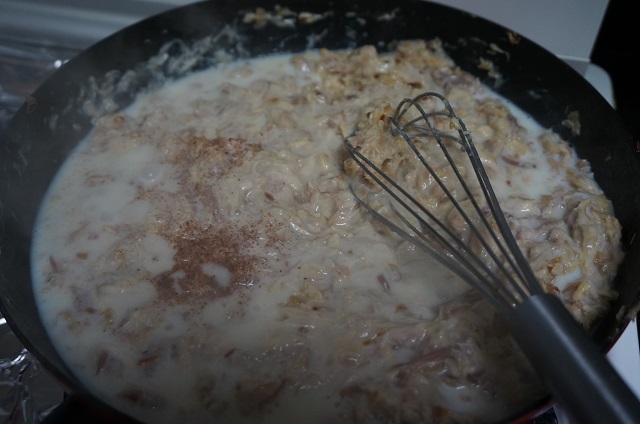 Cuando estemos echando la leche añadimos un poco de nuez moscada y un puntito de sal e iremos probando la masa para rectificarla de sal.