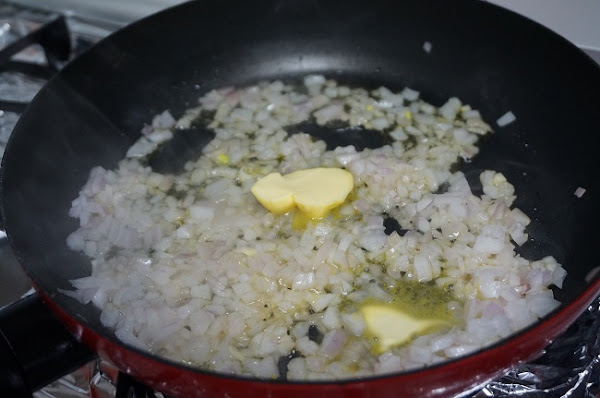 Ponemos una sartén con el aceite y la mantequilla a fuego medio, ponemos la cebolla muy picada, la dejaremos cocinar hasta que tome color.