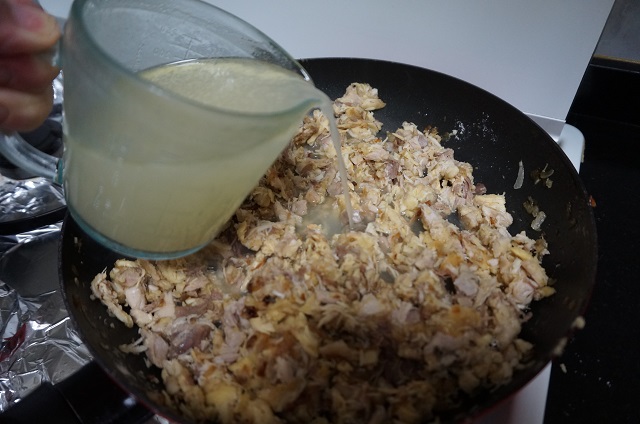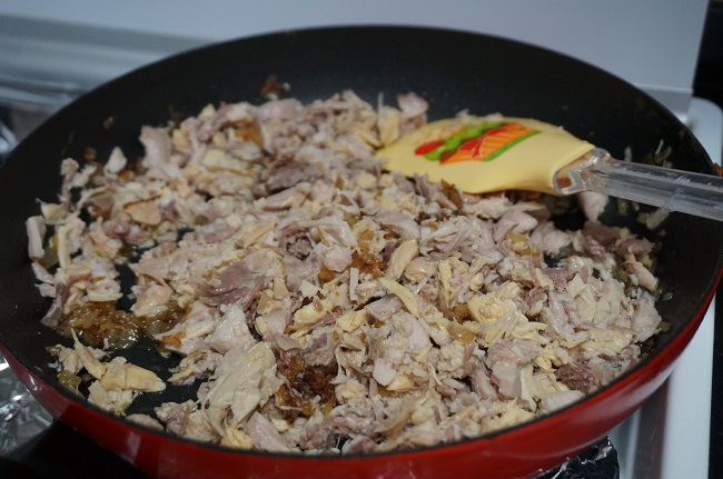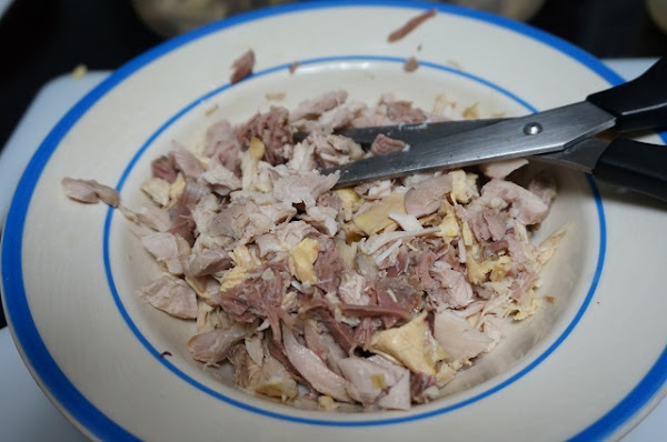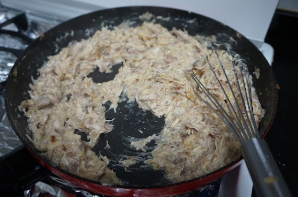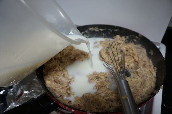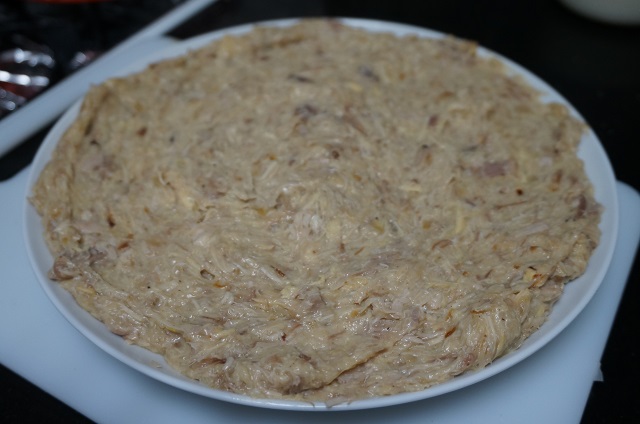 Lo primero será sacar la carne del cocido quitando los huesos y la grasa. La picaremos con una tijera o la picamos con la batidora así quedará como una masa. Como más os guste.