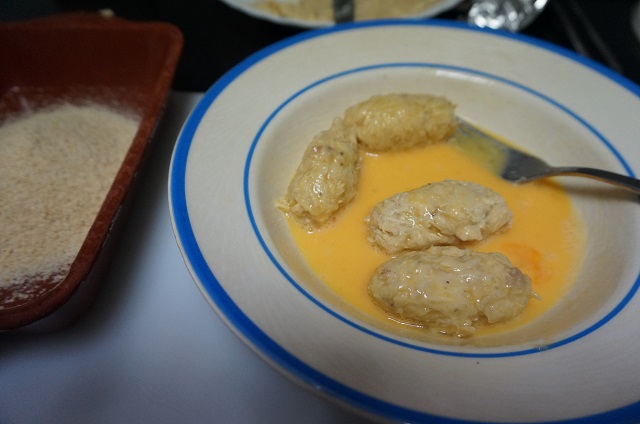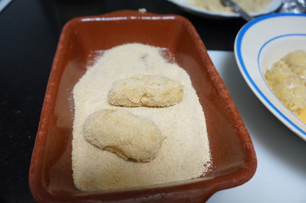 Para hacer las croquetas preparamos un bol con los 2 huevos batidos y otro con el pan rallado. Iremos formando las croquetas y las pasamos primero por el huevo y después por el pan rallado.