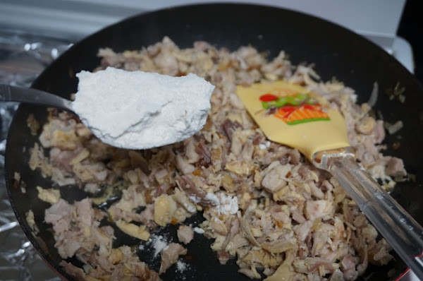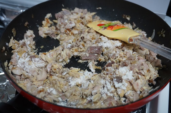 Seguido pondremos las cucharadas de harina. Tenemos que remover bien y dejar que se haga un poco la harina, un par de minutos.
