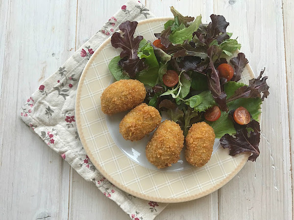 8. Para formar las croquetas, tomamos porciones con una cucharilla y le vamos dando su forma característica. Las pasamos por pan rallado, huevo batido y de nuevo por pan rallado. Las freímos en aceite bien caliente y las dejamos sobre un papel de cocina para que pierdan el exceso de grasa.
