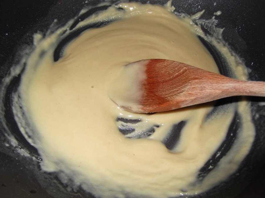 Una vez que la bechamel se despega de las paredes de la sartén, se añade la sal y la mezcla que tenemos en la batidora. Le damos un par de vueltas y cuando veamos que está consistente, la sacamos y la dejamos enfriar.